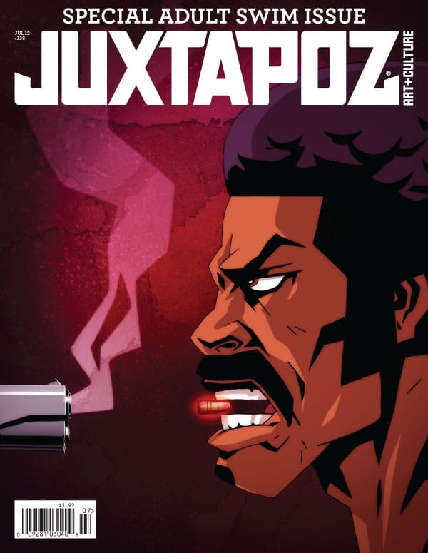 Yes, you read that right. Juxtapoz drops another impressive issue. Adult Swim has taken over ever feature, profile, photo, review, Pop Life moment, featuring their brand new program, Black Dynamite, on the cover in Juxtapoz #138. Includes in-depth interviews with the makers of Venture Bros, Squidbillies, Metalocalypse, Superjail!, Aqua Teen, Childrens Hospital, Robot Chicken, and Loiter Squad. Richly illustrated. Includes some brilliant illo drops from the likes of Wayne White, Skinner, Olek and Tim Biskup.