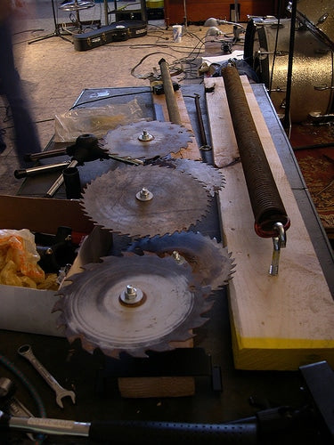 This installment is a twofer. During the second day of recording nickname: Rebel’s New Rock Church of Fire record (still working on it folks), I tried an experiment to loosen everyone up. Inspired by a session that Brown Cuts Neighbors had done for WRPI radio in Troy where, either the mics were cranked way up or the headphones in the studio were, so that every little movement or sound was incredibly loud, we tried the same sort of thing in a planned situation. I had a day of down-time in the studio (The old DeptEx/Magic Recording Eye studio of Jason Martin’s at 51 3rd St. in Troy) and scrounged the local Salvation Army and a couple hardware stores, and built a rotary saw cymbal stand (inspired by a similar rig of Steven Cerio’s and not uncommon in jazz circles) and a pair of bass springs (stretched out springs attached to a 2×4, amplified with either a guitar pickup or contact mic; inspired not just a little by Einsturzende Neubauten). So… Scott Smallwood, Aaron Smith and myself (and possibly Peter Barvoets?), recorded by Jason Martin, who had been instructed to crank everything as loud as it would go, consequences be damned, strolled into the studio (part of the composition as planned) and delicately touched and maneuvered the various implements of destruction. Various pianos, organs, electric razors, rebar, railroad spikes, walkie talkies and other detritus were also employed. Remember, it was not very loud in the room (and it was a very large room). A brief excerpt follows.