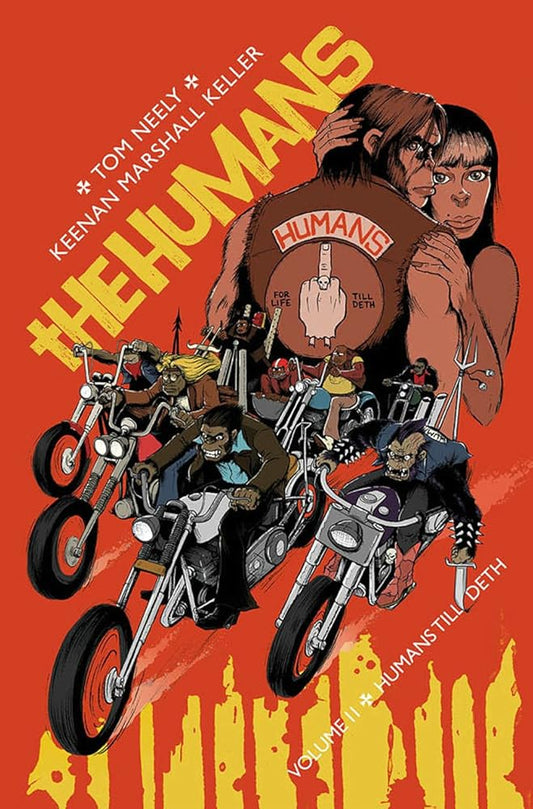 The Humans is a high-octane, no-holds-barred, ape-biker-gang chopper ride into ’70s exploitation genre bliss created by Tom Neely and Keenan Marshall Keller. Follow Bobby, Johnny, and all the Humans as they fight and fly down the road to oblivion on a ride filled with chains, sex, leather, denim, hair, blood, bananas, and chrome.