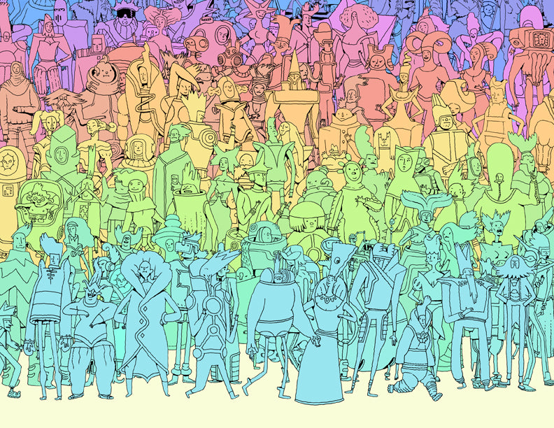 A collection of drawings of people from the future that Andy drew on the bus on the way to work. The title pretty much describes it: “one hundred and forty people from the future, twelve cavemen, one old-timey muscle man, nine beach bums, five pirates, a dog, and a monster.”
