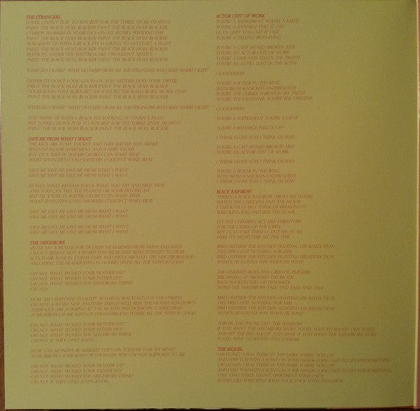 Tracklist: A1. The Strangers, A2. Save Me From What I Want, A3. The Neighbors, A4. Actor Out Of Work, A5. Black Rainbow, A6. The Sequel, B1. Laughing With A Mouth Of Blood, B2. Marrow, B3. The Bed, B4. The Party, B5. Just The Same But Brand New