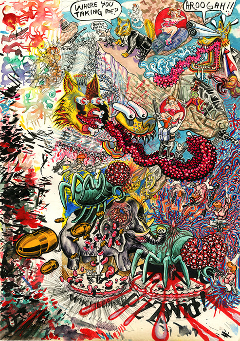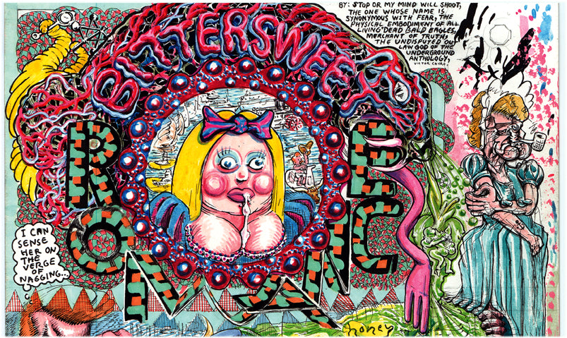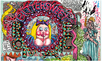 Victor "Bald Eagles" Cayro has been working in the field of comix for several years. His work has been seen in various anthologies including, Kramers Ergot 6, Project Superior, Typhon, Rub The Blood, and several others? but he has yet to create his own stand alone comic. Until now? Over time, working endlessly hunched over thousands of drawings, his viscous humor and unabridged anger has melded with his visionary psychedelic imagery into a hammer of visual might. Unafraid to trample the subjects most tip-toe around, Bald Eagles not only uses symbols, language, and images of pain, violence and ignorance but revels in these taboos? Pushing those whom read his work to react, think, respond?