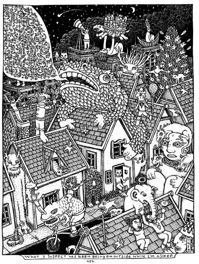 Capacity tells the fantastically true and truly fantastic personal history of the artist as a young man. Theo Ellsworth's astonishing drawings, which Pitchfork describes as "a combination of Where the Wild Things Are, a fever dream, a pagan woodland ceremony, and a notebook doodle," give shape to thoughts profound and silly, bringing familiar doubts and hopes to visionary, new life. Just try to remember, this all really happened.