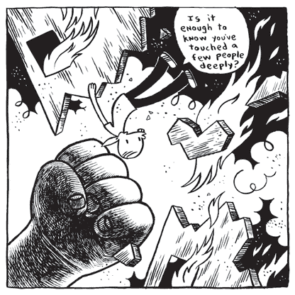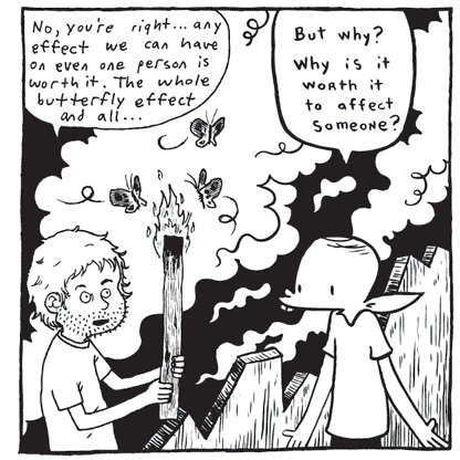 In this issue, James Kochalka goes up against rising indy-comics star, Jeffrey Brown (Darth Vader and Son). The two cartoonists draw together, exchanging pages back and forth, and trade metaphorical jabs in a discussion that quickly devolves into an argument, which quickly devolves into a brawl about art and comics and the role such things play in our lives. See Jeffrey Brown turn into a city-destroying giant! See James Kochalka slap Jeffrey silly with a vomit-covered mop. Discussing art & life has never been more action-packed, or funnier.