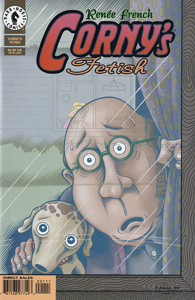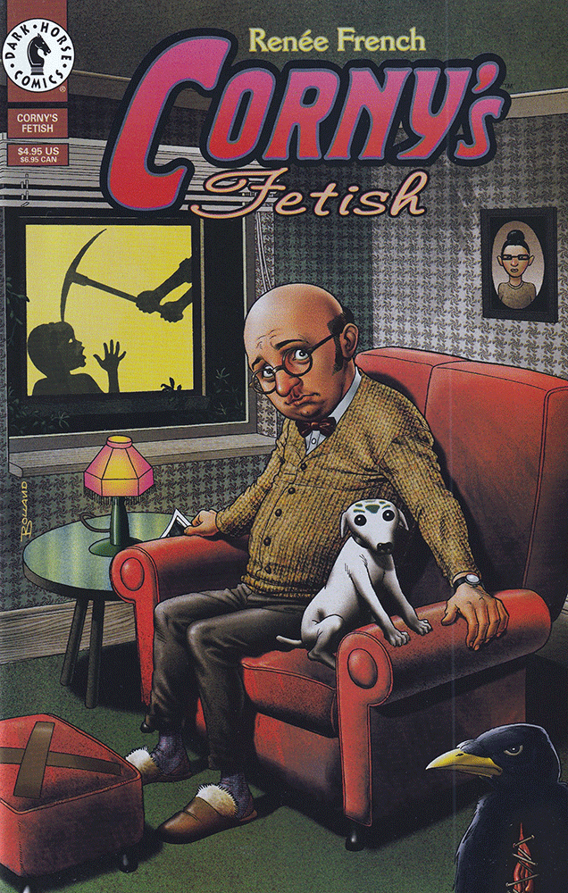 Corny is a lonely guy with a crush on his next door neighbor. He watches her life from his window, and imagines himself in it. When bad things begin to happen, Corny knows he has what it takes to comfort her, but cowardice forces him to do it anonymously. Corny is in a tug-of-war between fantasy and reality, and at the center is his heart. This sweet story of an ill-fated romance of the mind is by Renée French, the crafty, twisted imagination behind the hit comic The Ninth Gland. Plus, two covers — a front cover by Brian Bolland and a back cover by Peter Bagge.