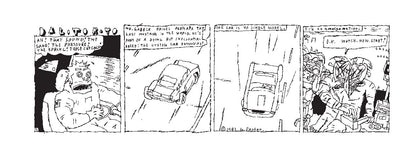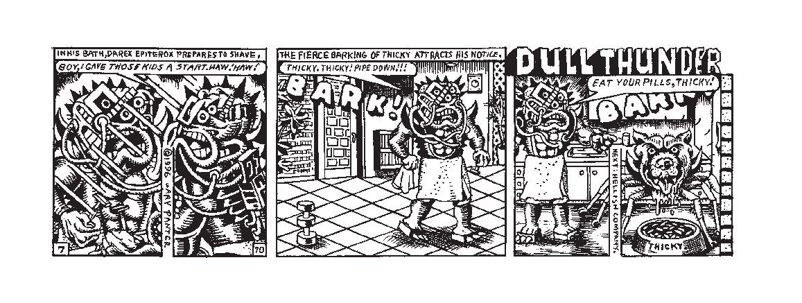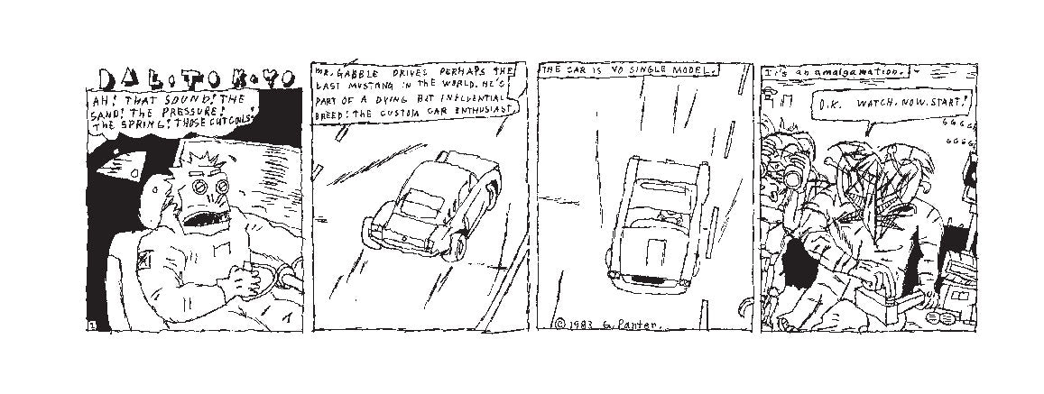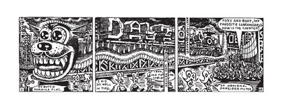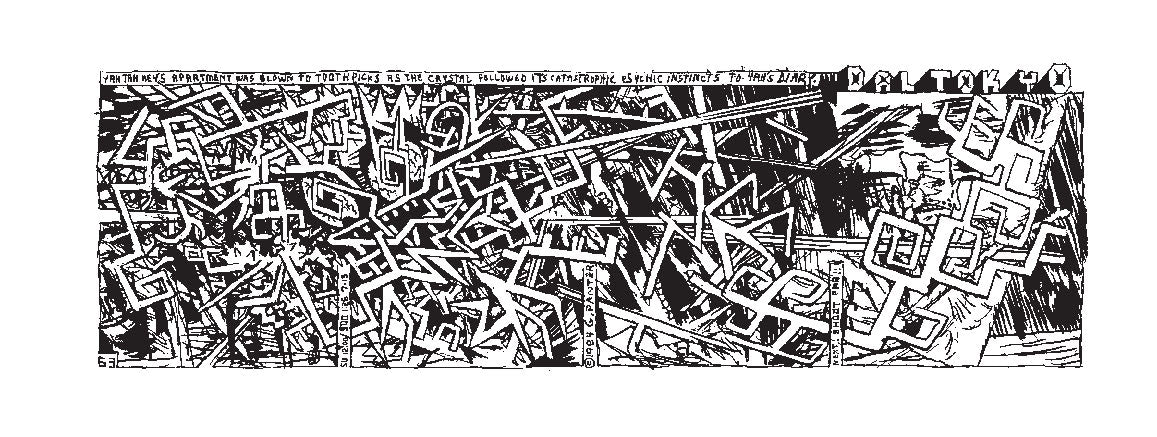 In 1983, Panter finally got a chance to fully explore this world, and share it with an audience, when the L.A. Readerpublished the first 63 strips. A few years later, the Japanese reggae magazine Riddim picked up the strip, and Panter continued the saga of Dal Tokyo in monthly installments for over a decade. But none of these conceptual descriptions will prepare the reader for the confounding visual and verbal richness of Dal Tokyo, as Panter’s famous “ratty line” collides and colludes with near-Joycean wordplay, veering from more or less intelligible jokes to dizzying non-sequiturs to surreal eruptions that can engulf the entire panel in scribbles. One doesn’t read Dal Tokyo; one is absorbed into it and spit out the other side.