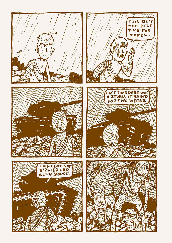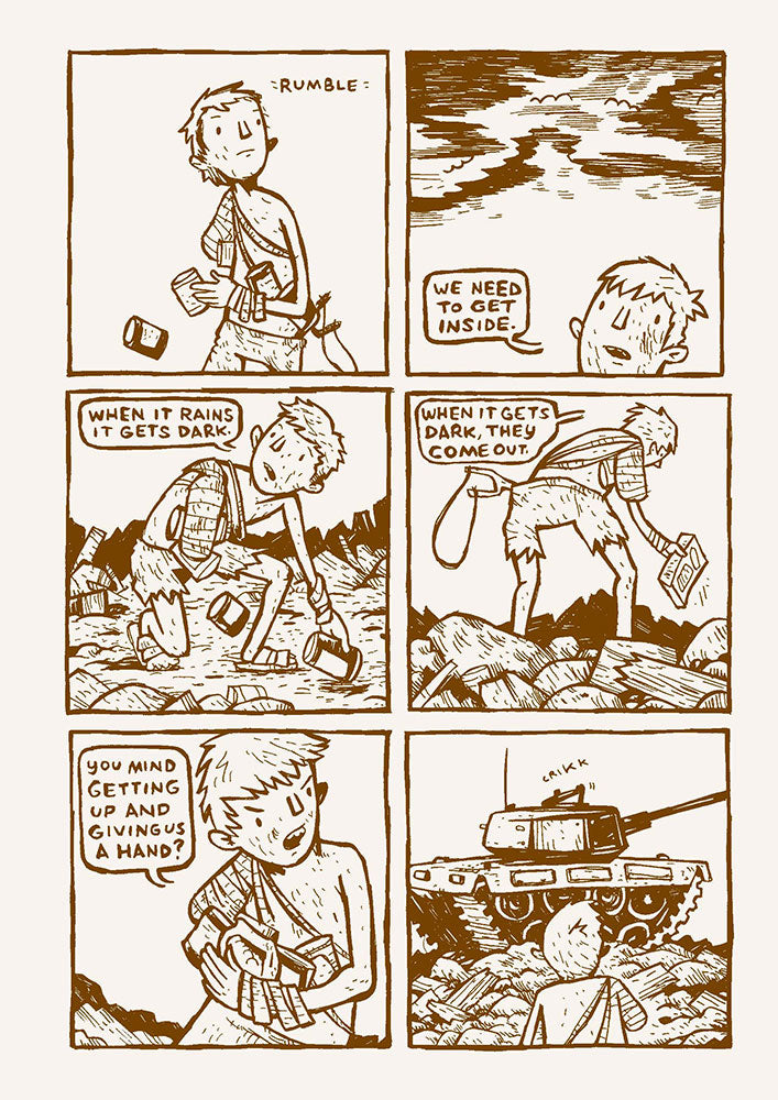 You wake up in the rubble and see a ragged, desperate one-armed man greeting you. He takes you underground to a safe space, feeds you, offers you a place to sleep. And then announces that he’ll take the first watch. It’s not long before the peril of the jagged landscape has located you and your newfound protector and is scratching at the door. What transpires is a moment-to-moment struggle for survival—The Road meets Dawn of the Dead. Daybreak is seen through the eyes of a silent observer as he follows his protector and runs from the shadows of the imminent zombie threat. Brian Ralph slowly builds the tension of the zombies on the periphery, letting the threat—rather than the actual carnage—be the driving force. The postapocalyptic backdrop features tangles of rocks, lumber, I beams, and overturned cars that are characters in and of themselves.