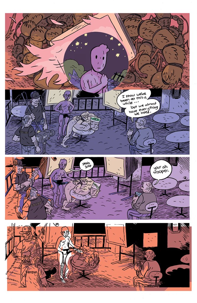 Ben has been turned into a cockroach and in love with a woman formed from his sticky leaky guts. Meanwhile, murderous mutant cops, vampires, and TV-faced dragons wander the irradiated landscape. Heart warming, right? There is violence and comedy—gory, punk, and kinda unromantic. New comics from Your Black Friend author Ben Passmore.