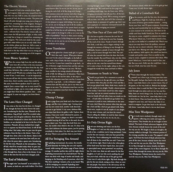 Tracklist: A1. The Electric Version, A2. From Blown Speakers, A3. The Laws Have Changed, A4. The End of Medicine, A5. Loose Translation, A6. Chump Change, A7. All for Swinging You Around, B1. The New Face of Zero and One, B2. Testament to Youth in Verse, B3. It's Only Devine Right, B4. Ballad of a Comeback Kid, B5. July Jones, B6. Miss Teen Wordpower