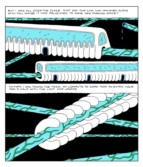 The bodies of citizens and the infrastructure surrounding them is constantly updating. People can’t recognize themselves in old pictures, and they wake up in apartments of completely different sizes and shapes. Commuter routes radically differ day to day. The citizens struggle with adaptability as updates happen too quickly, and the changes are far too radical to be intuitive. There is no way to resist—the updates are enacted by a nameless, faceless force.