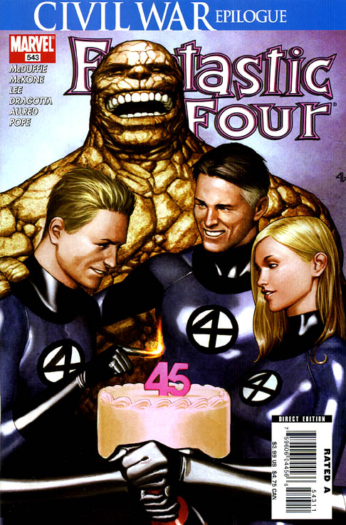 The 45th Anniversary issue of Fantastic Four. Three stories: Civil War epilogue by the late Dwayne McDufie and crew; "If This Be... Anniversary!" by Stan Lee & Michael Allred and the 12-page "A Day at The Races by Paul Pope with colors by Jose Villarrubia.