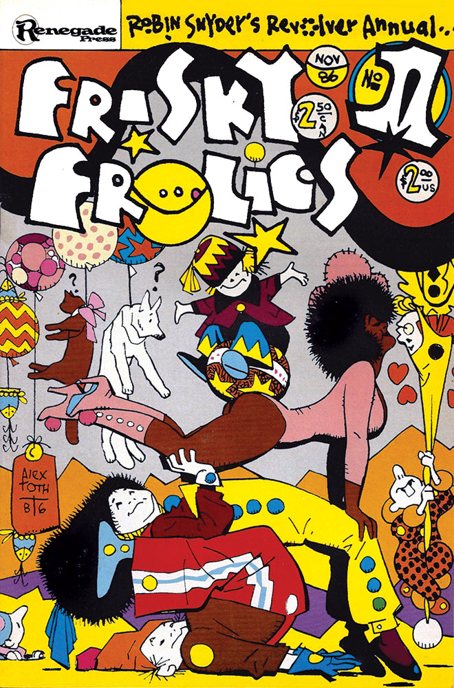 Robin Snyder's Revolver Annual Frisky Frolics #1. Classic loose and fun cover by Alex Toth. Black and white comics anthology with Steve Ditko's 'Killjoy', 'The Thought and The Egg' by Doug Moench and Ernie Colรณn and early work by Erik Larsen (one year before his 'major label' debut on Spider-Man). Back cover by Pat Boyette.
