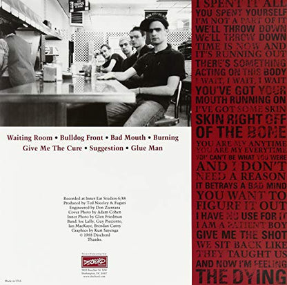 This is Fugazi's debut record, released in 1988. These 7 songs songs were later combined with the 6 tracks from the Margin Walker EP and released on the 13-Songs Maxi CD. This 12" EP (on black vinyl) was re-cut from the Silver Sonya masters in 2008 at Chicago Mastering Service and comes with a free MP3 download of the album. Recorded at Inner Ear Studios. Produced By Ted Nicely. Engineered by Don Zientara. Graphics by Kurt Sayenga. Photography by Adam Cohen & Glen Friedman.