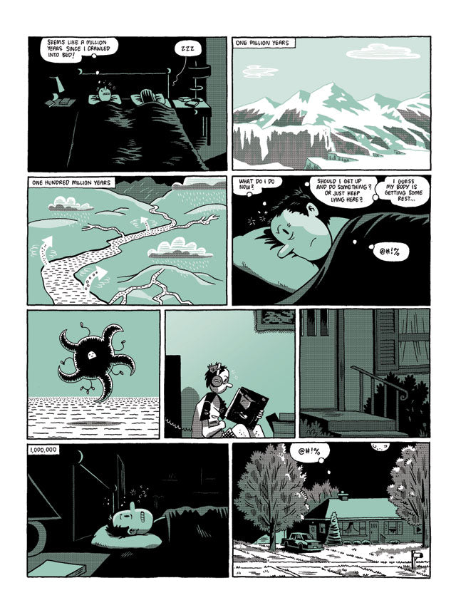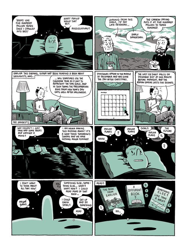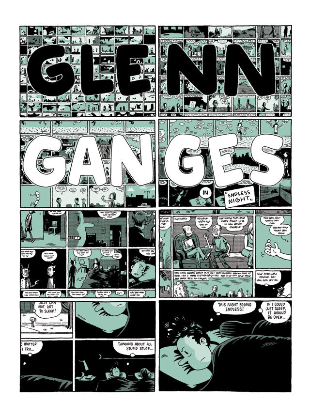 Can you make an exciting comic out of insomnia? Kevin Huizenga rises to the challenge as he depicts his alter ego Glenn Ganges wrestling with sleeplessness, trying to trick it by reading a particularly abstruse book, obsessively breaking his past, present and future life into ever more hallucinatory, complex grids, and wandering around his darkened house trying not to wake up his wife. Also: Loose cat action!
