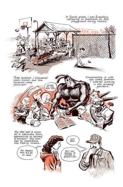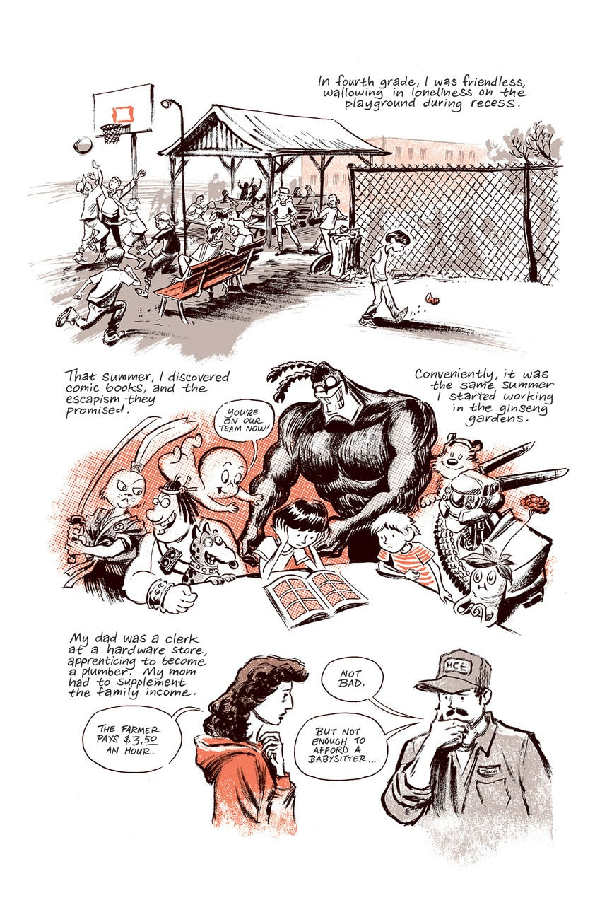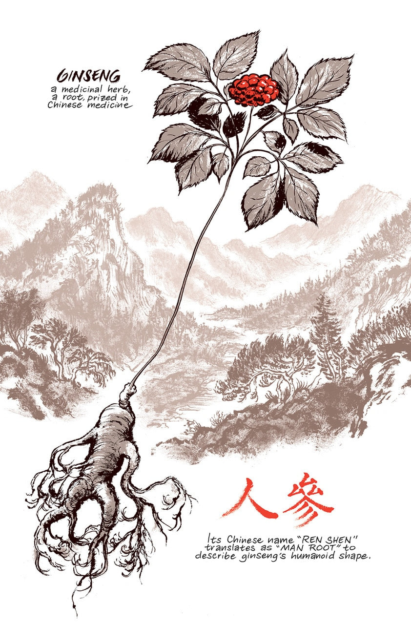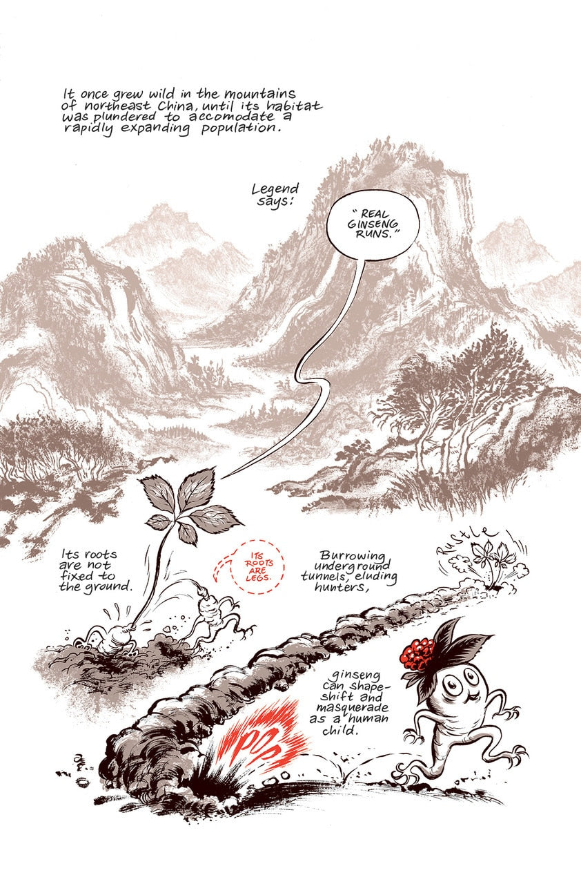 Now, for the first time in his career, Thompson is working in serial form, in a bimonthly comic book series. Part memoir, part travelogue, part essay—all comic book—Ginseng Roots explores class divide, agriculture, holistic healing, the 300 year long trade relationship between China and North America, childhood labor, and the bond between two brothers.
