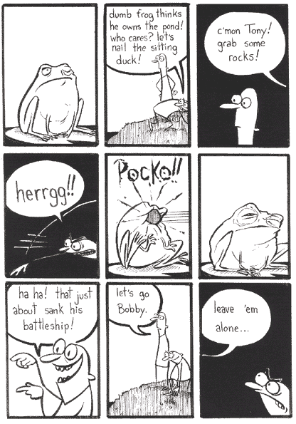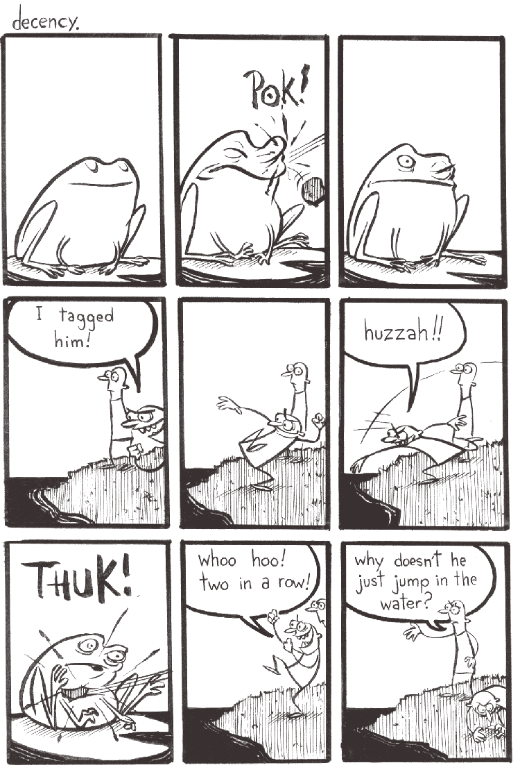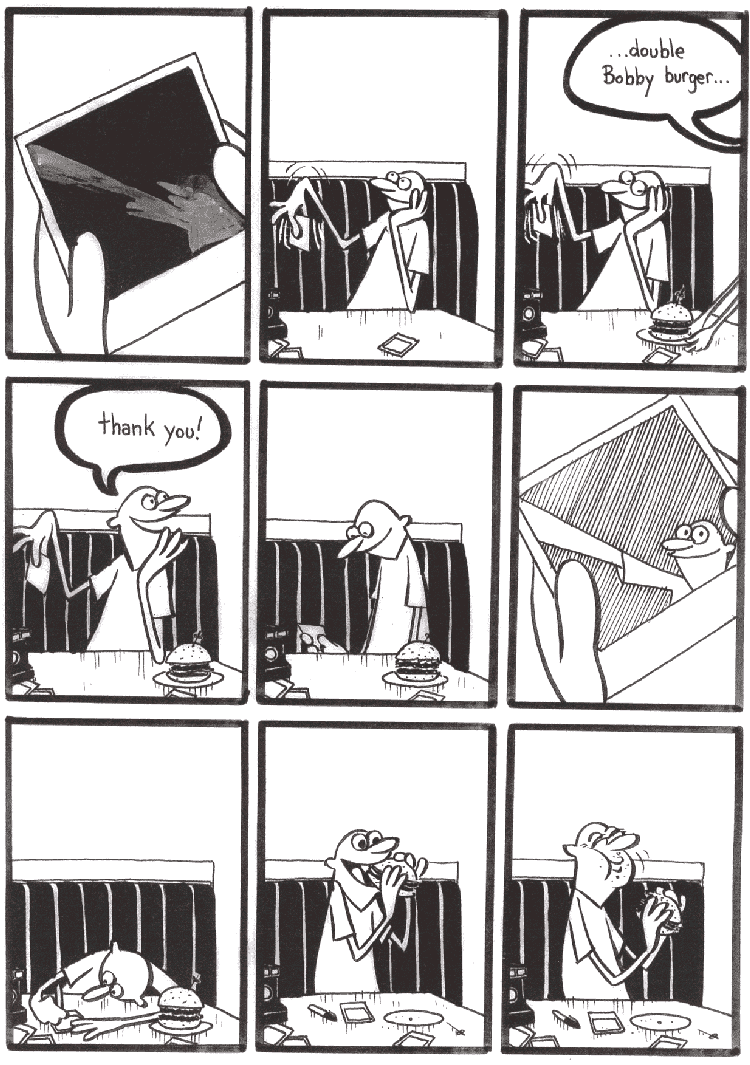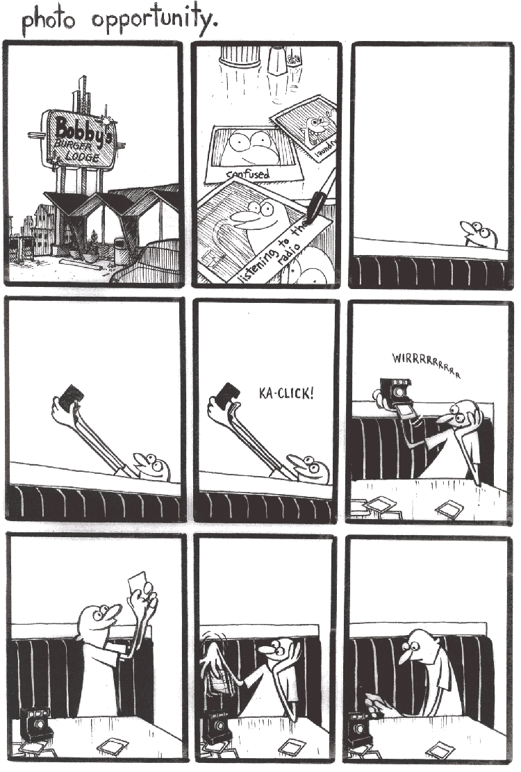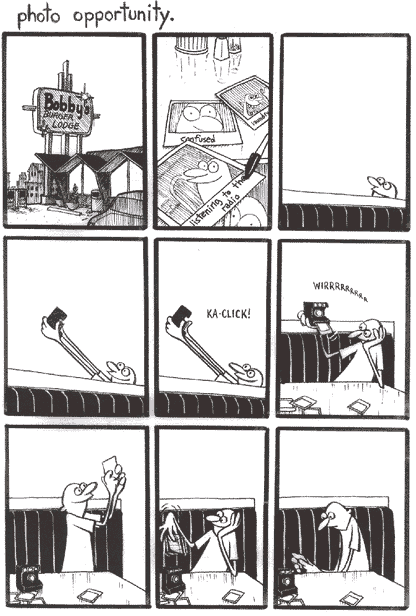 Annable has been creating these stories for his own satisfaction concurrent with his commercial animation work, and it shows in their intimate, conversational tone and wholly personal outlook. The skills honed at his day job are just as evident in the deft, fluid way he puts his stylish figures through their paces — it's like listening to the eloquent solo improvisations of a jazz musician who has sharpened his chops playing every night in the band. Even several panels of an Annable character just sitting still at a table practically glitter with life and cartoon joy.