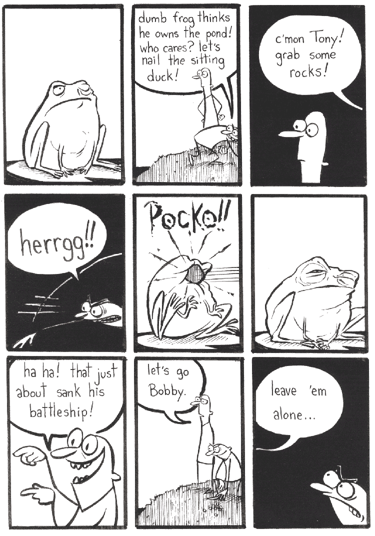 A man is carried safely through the ugly harshness of the world by his own Polaroid-enabled brand of narcissism. The sadistic make-believe of two little boys is no match for the laid-back cruelty of their grandfather. Two buddies go on an ice fishing trip. One finds enlightenment, but the other catches a whole hell of a lot of fish. A factory drone discovers his creative side with the help of the toilet. Vehicular manslaughter turns to be pretty okay as long as there aren't any witnesses. Sound interesting? Wait till you see them come to life in vivid black-and-white! Grickle is a hefty treasure trove of visually arresting, hilarious, wise, and emotionally rereadable cartoon stories.