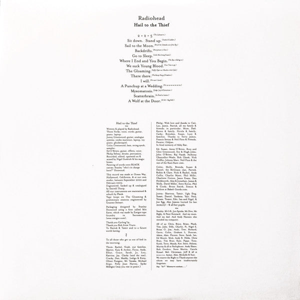 Tracklist: A1. 2 + 2 = 5 (The Lukewarm.), A2. Sit Down. Stand Up. (Snakes & Ladders.), A3. Sail To The Moon. (Brush The Cobwebs Out Of The Sky.), B1. Backdrifts. (Honeymoon Is Over.), B2. Go To Sleep. (Little Man Being Erased.), B3. Where I End And You Begin. (The Sky Is Falling In.), C1. We Suck Young Blood. (Your Time Is Up.), C2. The Gloaming. (Softly Open Our Mouths In The Cold.), C3. There There. (The Boney King Of Nowhere.), C4. I Will. (No Man's Land.), D1. A Punchup At A Wedding. (No No No No No No No No.), D2. Myxomatosis. (Judge, Jury & Executioner.), D3. Scatterbrain. (As Dead As Leaves.), D4. A Wolf At The Door. (It Girl. Rag Doll.)