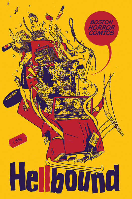 Boston Horror Comics. New England's most disturbed comic creators present a dozen nightmares in black and white: a fiend in the next hospital bed, a comic book that drives men to murder, a plague with feathers, a love-triangle in a cemetery... plus a whole unholy host of demons, psychos and misunderstood monsters. These will be your companions for a cozy evening of blood and gore and over-the-top horror as you snuggle up with the second volume of Hellbound.