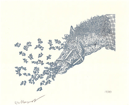 Signed, Limited edition of 80. Blue ink on thick cream print paper, 7.75 x 9.25 inches.