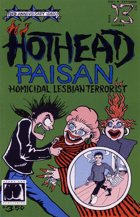 Hothead Paisan: Homicidal Lesbian Terrorist features the title character generally wreaking violent vengeance on male oppressors. Recurring characters include Hothead's cat Chicken, her wise mystical friend Roz, a talking lamp, and her lover Daphne. v