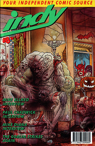 The Halloween Horror Special! Indy presents a full-color cover by Tim Vigil, as well as an exclusive interview with the talented co-creator and artist of the controversial Faust. Plus: interviews with Mike Allred, Paul Chadwick & Mike Diana, and The Goblin Strikes Again.