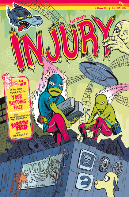 Hot rod premier issue of Injury Comics. In this issue, punk artist Jeff Wilson's true-life story of his junior high attempt to score his first joint and enjoy his new heavy metal albums - with hilarious consequences. Also, in a post-apocalyptic dystopia, misanthropic cyborg Manleau is attacked by the Fighting Cock, a member of local untouchable gang the Barnyard Animals. As laughing street urchins look on, can Manleau survive the onslaught of this vicious gang member? Plus, find out what happens when Hercules gets cloned! File this one under future cyborg mayhem punk weed burnout metal garage comic.
