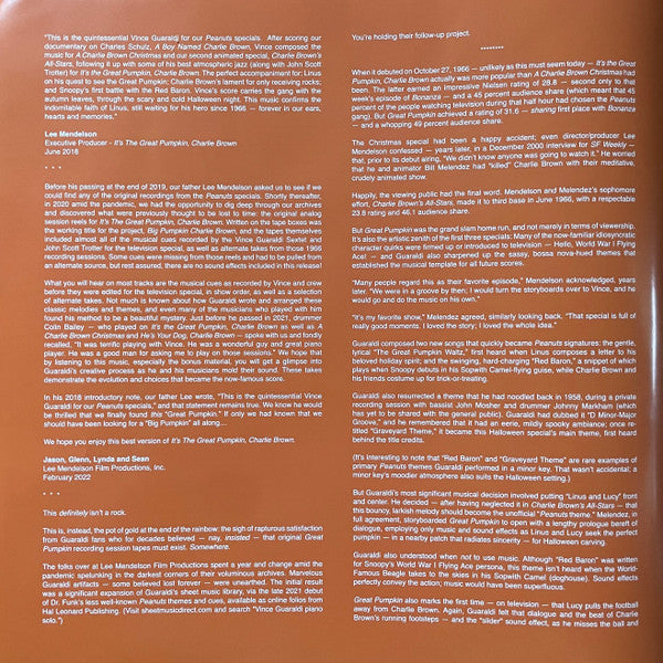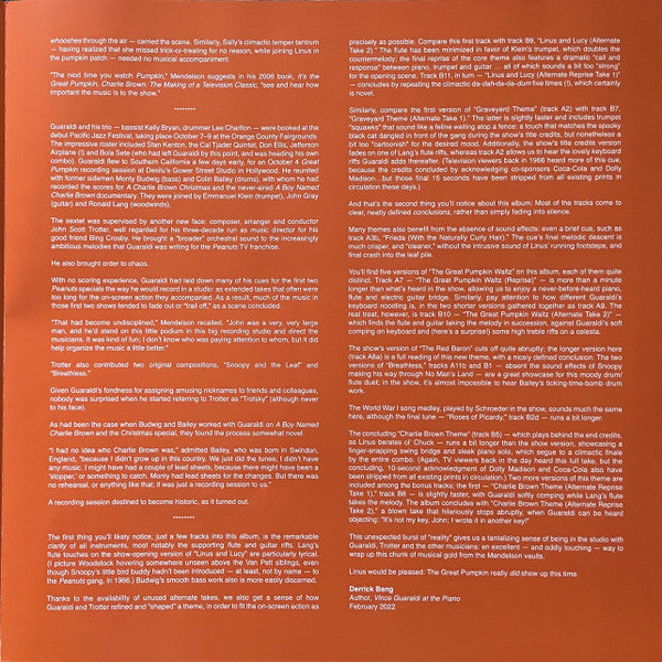 Tracklist: A1. Linus And Lucy, A2. Graveyard Theme, . Snoopy And The Leaf / Frieda (With The Naturally Curly Hair), A4. The Great Pumpkin Waltz, A5. Linus And Lucy (Reprise), . Charlie Brown Theme / Charlie Brown Theme (Minor Theme) / Graveyard Theme (Reprise), A7. The Great Pumpkin Waltz (Reprise), . The Red Baron / Military Drum March, . The Great Pumpkin Waltz (2nd Reprise) / The Great Pumpkin Waltz (3rd Reprise), A10. Graveyard Theme (Trick Or Treat) (2nd Reprise), . Fanfare / Breathless / Graveyard Theme (Trick Or Treat) (3rd Reprise), A12. Charlie Brown Theme (Reprise), B1. Breathless (2nd Reprise), . It's A Long Way To Tipperary / There's A Long, Long Trail A-Winding / Pack Up Your Troubles In Your Old Kit Bag / Roses Of Picardy, B3. Graveyard Theme (Trick Or Treat) (4th Reprise), . Linus And Lucy (2nd Reprise) / Linus And Lucy (3rd Reprise), B5. Charlie Brown Theme (2nd Reprise), B6. Linus And Lucy (Alternate Take 1), B7. Graveyard Theme (Alternate Take 1), B8. Charlie Brown Theme (Alternate Reprise Take 1), B9. Linus And Lucy (Alternate Take 2), B10. The Great Pumpkin Waltz (Alternate Take 2), B11. Linus And Lucy (Alternate Reprise Take 1), B12. Charlie Brown Theme (Alternate Reprise Take 2)