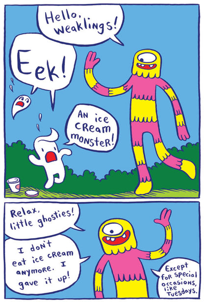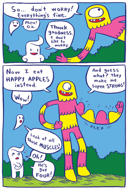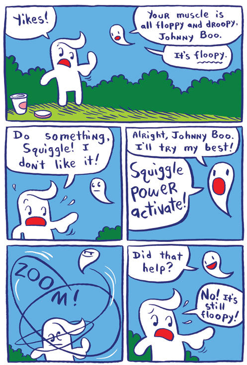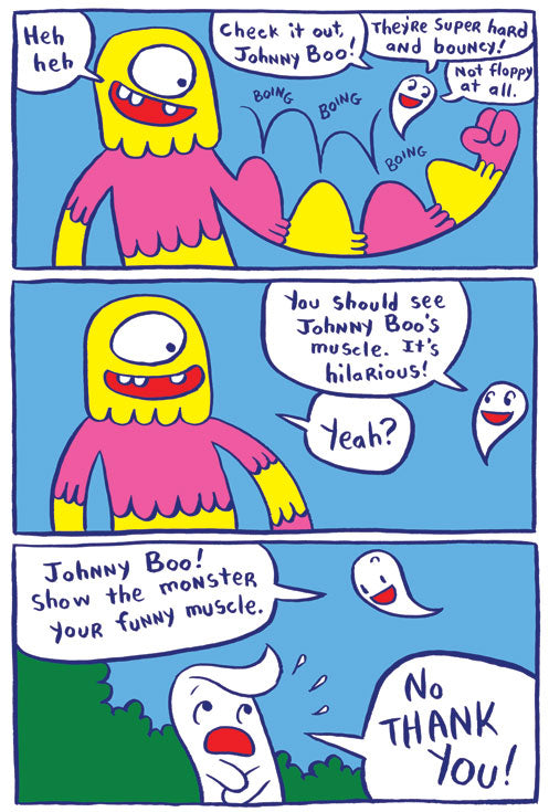 In this adventure, Johnny Boo has been eating a little too much ice cream, and now his muscles have gotten all floppy and droopy. Why, they're positively floopy! Meanwhile, our friend the Ice Cream Monster has changed his gluttonous ways and now has big strong muscles, thanks to his new favorite food: apples! Terribly embarrassed by his own puny muscles, Johnny Boo sets out on a quest to find some happy apples that can give him strong happy muscles. But it won't be easy... especially if the Ice Cream Monster mistakes him for a delicious dollop of ice cream! And is that a television inside the monster's belly!? It all adds up to a very silly story about eating healthy.
