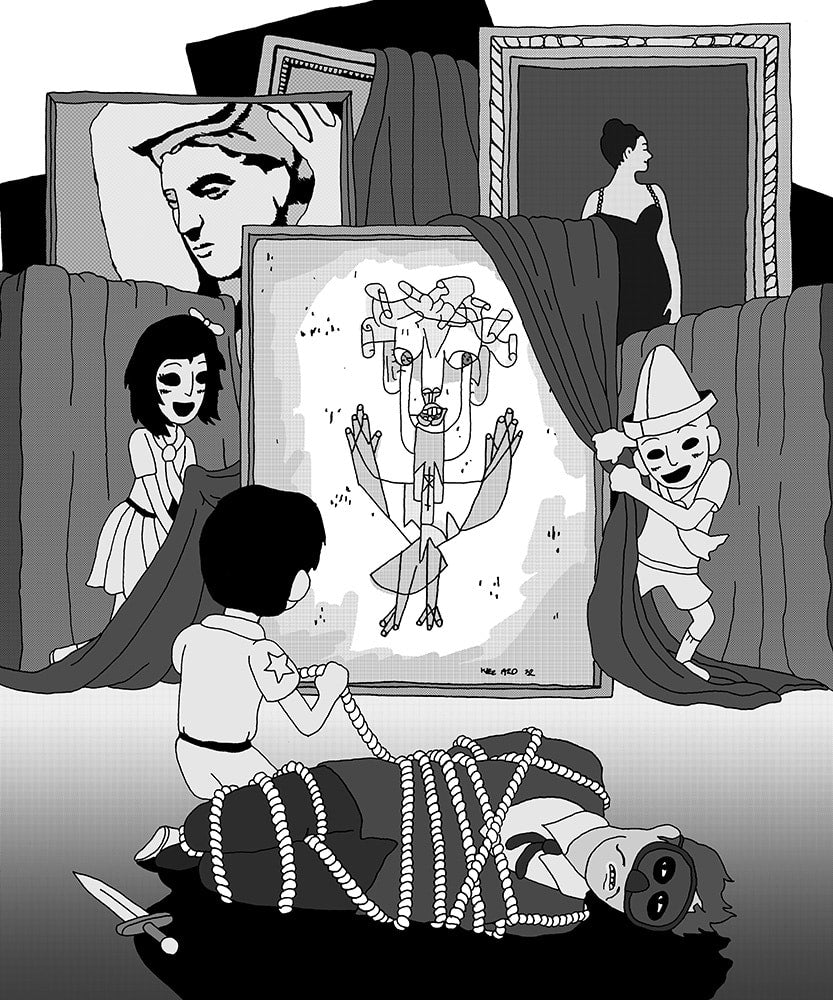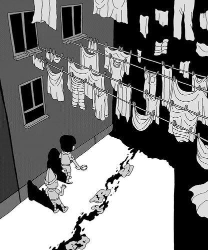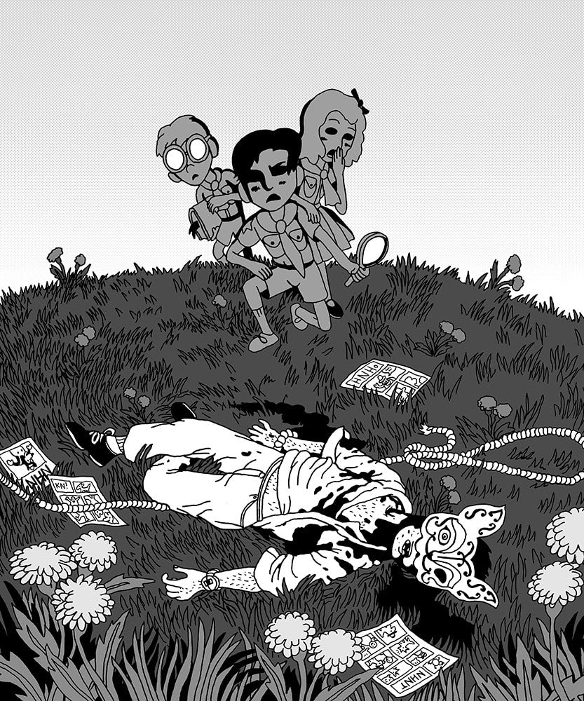 "This abstract Hardy Boys/Nancy Drew phantasmagoria catalogs all the things we were afraid of as children that we forgot we should still be afraid of as grownups: the woods, the sea, the dark, adults, adult relations, gender roles, our bodies, our selves. adactivity’s art indicates a broad swath of influences, at times suggesting a Black Hole for tots, then a Suehiro Maruo run of Peanuts. Don’t miss this tiny beast of a book.” — Claire Donner