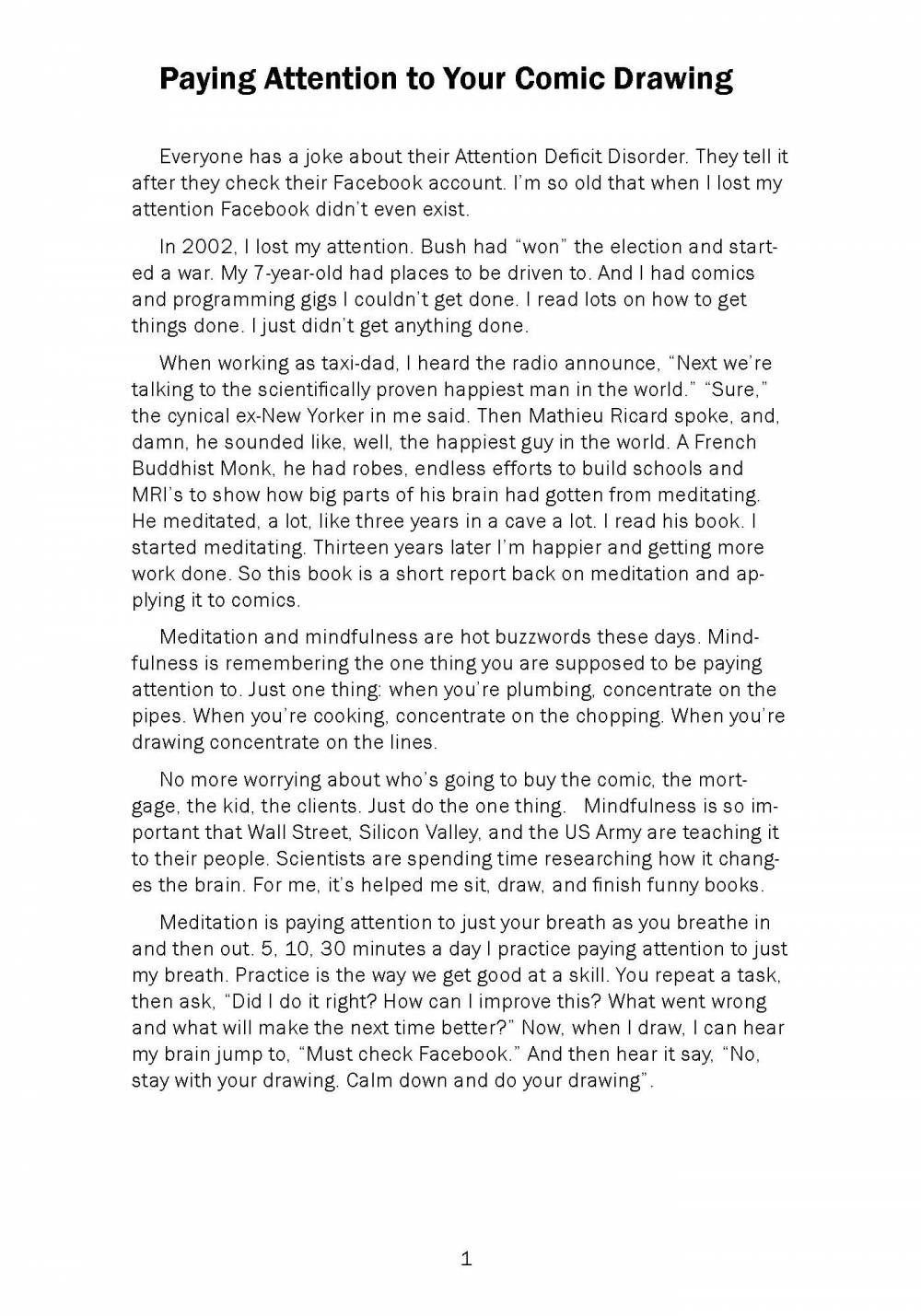 A workbook on the practice of drawing comics and mindfulness. Includes many exercises for the distracted confused and overwhelmed artist to calm down and complete their work.