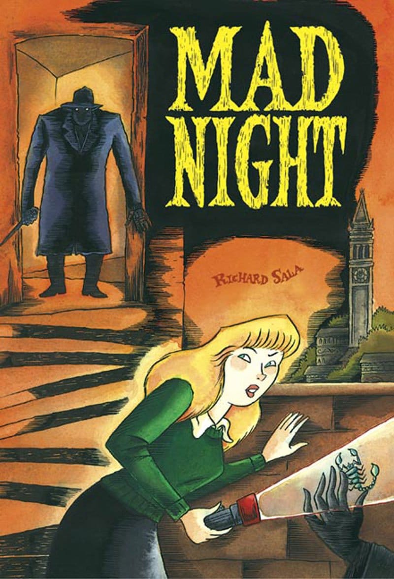 In Mad Night, his follow-up to The Chuckling Whatsit, Sala follows ace detective Judy Drood and her reluctant companion Kasper Keene as they try to unravel a string of mysterious occurrences and heinous murders in the usually tranquil Lone Mountain College. What is the sinister secret of Professor Massimo Ibex? How is the (literal) puppet mistress Aunt Azalea and her bevy of beauteous pirate girls involved? Where does the lithping, er, lisping, corrupt cop Pinch fit in? And what exactly is the significance of the Glass Scorpion?