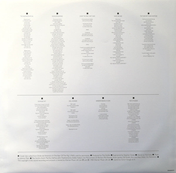 Tracklist: A1. The Headmaster Ritual, A2. Rusholme Ruffians, A3. I Want The One I Can't Have, A4. What She Said, A5. That Joke Isn't Funny Anymore, B1. Nowhere Fast, B2. Well I Wonder, B3. Barbarism Begins At Home, B4. Meat Is Murder