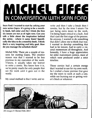 MF: Right. So my schedule is a big mess of to-do lists. I'm also the person who processes the orders, stuffs the envelopes, makes sure I'm covering the costs, then it's back to drawing. Chuck Forsman does it, I'm sure he's developed a way to make it all move along, but it's a pretty intense routine. It had to be done, though. I had no other option