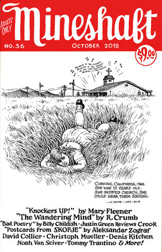 Timeless and Beautiful front & back cover art by Robert Crumb! PLUS... "Excerpts from R. Crumb's Dream Diary" and "The Wandering Mind" by Crumb! "Knockers Up!" by Mary Fleener! "Bad Poetry by Billy Childish! Justin Green Reviews Crook! New work by Christoph Mueller, Denis Kitchen, David Collier, Noah Van Sciver, Tommy Trantino, Aleksandar Zograf, Rika Deryckere, Mick Guffan, Peter Poplaski, John Porcellino, Leonardo da Vinci, Pat Moriarity, Robert Armstrong, And More!!!