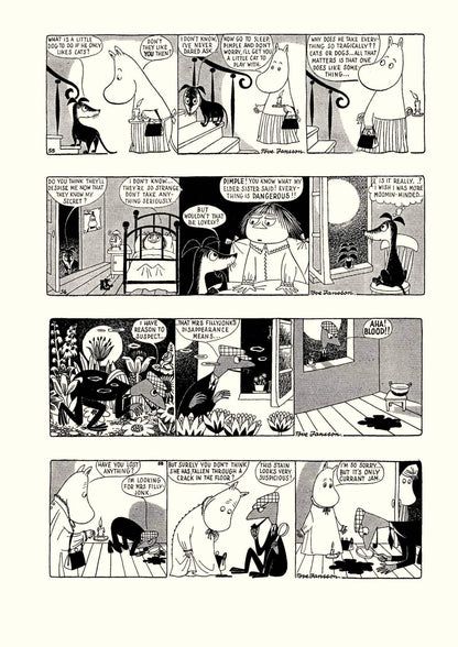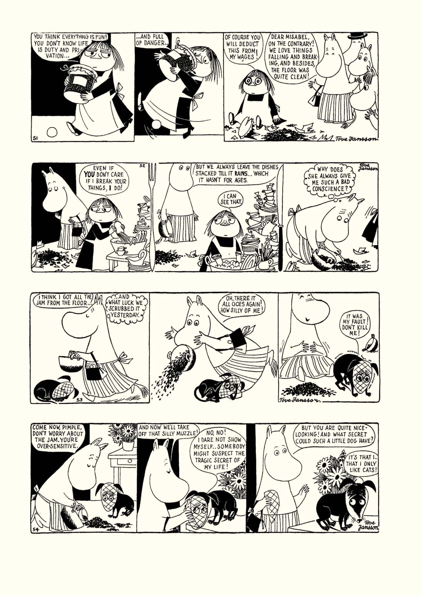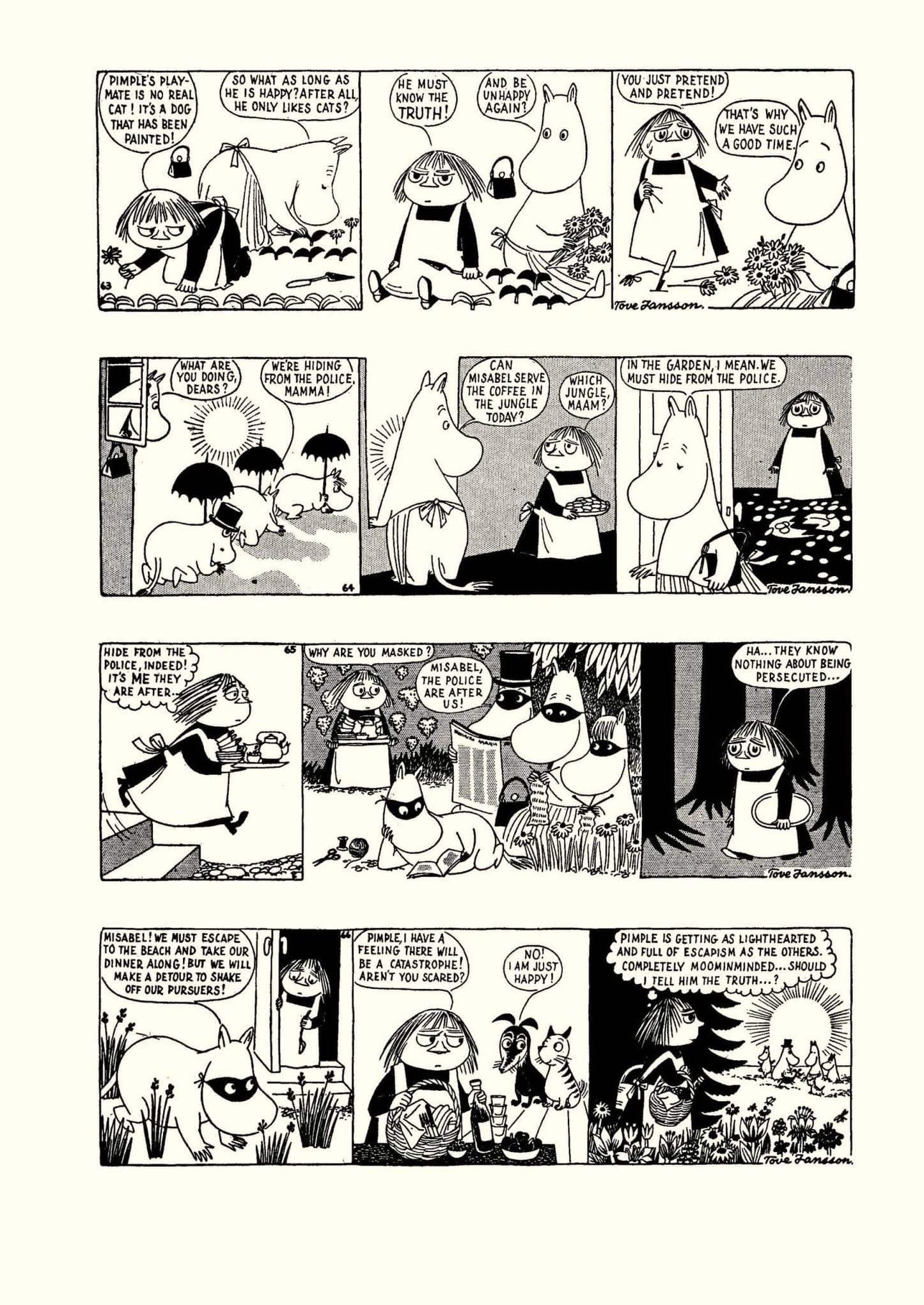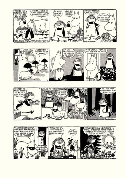 In the second volume of Tove Janssonโs humorous yet melancholic Moomin comic strip, we get four new stories about jealousy, competition, child rearing, and self-reinvention. The Moomins try to hibernate in the fashion of their ancestors but insomnia places them smack-dab into a winter carnival with the winter-sports-loving Mr. Brisk. The fickle and eternally lovestruck Mymble and Snorkmaiden find themselves in competition over a thrilling new man. Moominmamma meets her new neighbor, the Fillyjonk, causing her to hire the depressed and secretive Misabel as her new maid. Mymbleโs mother arrives on the Moomin familyโs doorstep with her seventeen new children. Finally, a prophet arrives on the scene declaring that the happy Moomins are in fact not happy at all and need to get back to nature and be free. Moomin, of course, becomes more and more miserable the freer he gets.