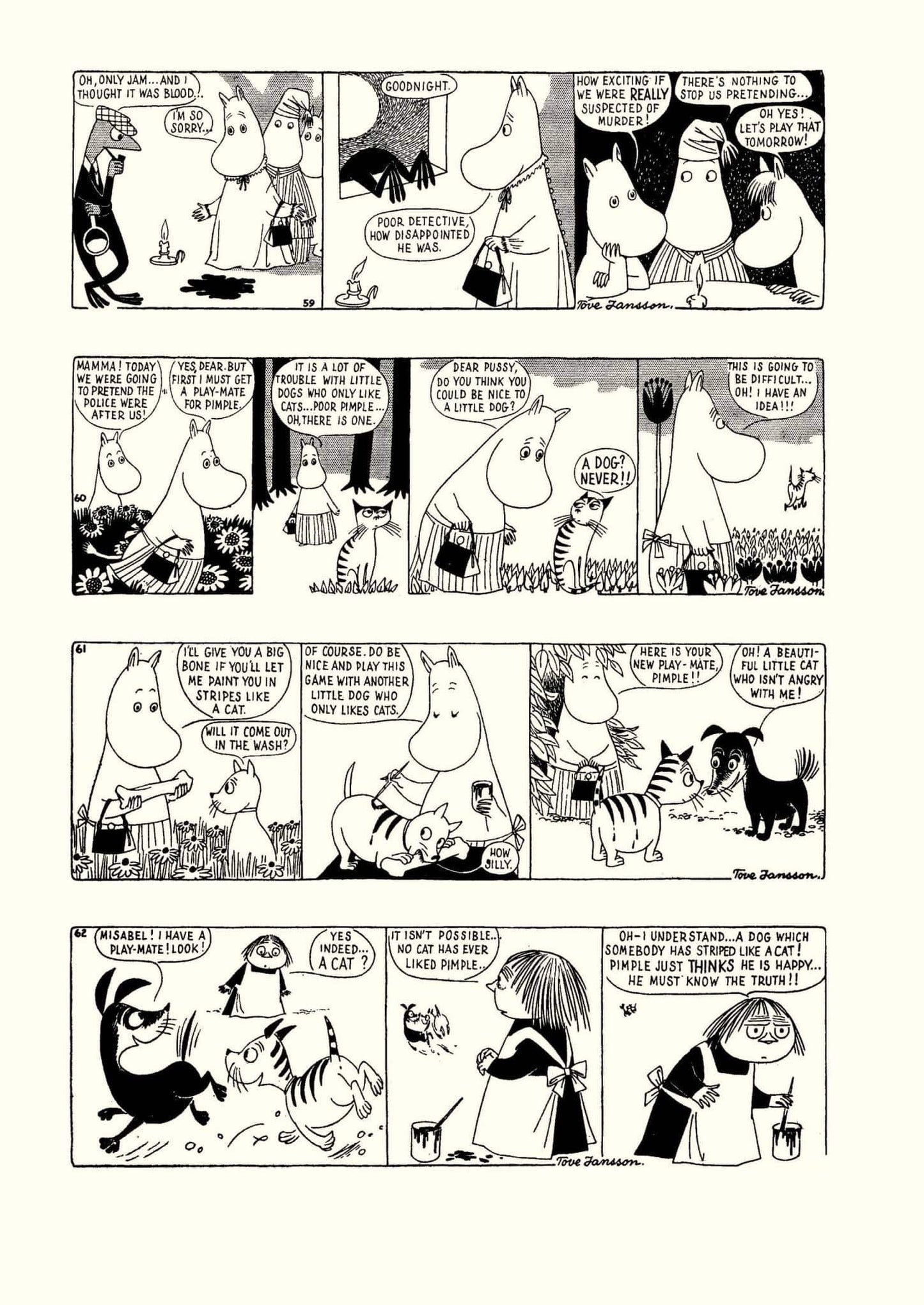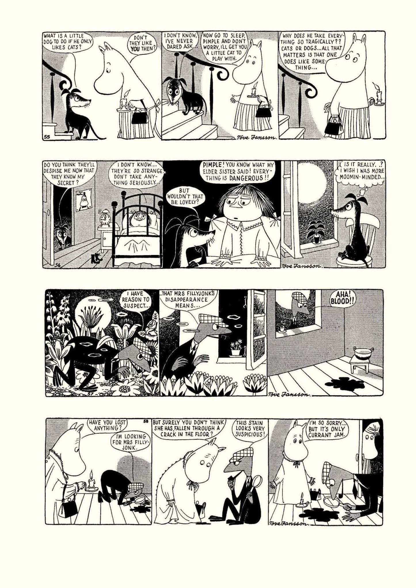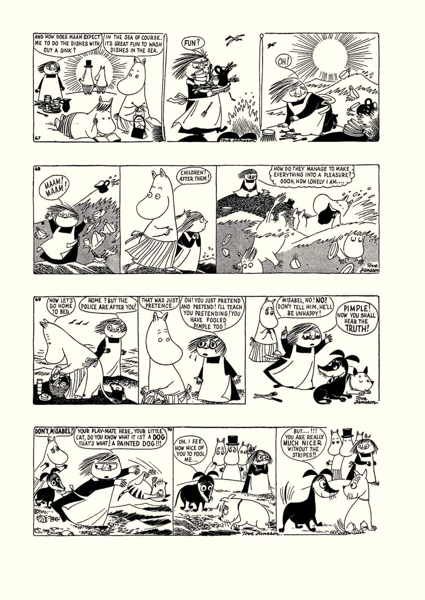 In the second volume of Tove Janssonโs humorous yet melancholic Moomin comic strip, we get four new stories about jealousy, competition, child rearing, and self-reinvention. The Moomins try to hibernate in the fashion of their ancestors but insomnia places them smack-dab into a winter carnival with the winter-sports-loving Mr. Brisk. The fickle and eternally lovestruck Mymble and Snorkmaiden find themselves in competition over a thrilling new man. Moominmamma meets her new neighbor, the Fillyjonk, causing her to hire the depressed and secretive Misabel as her new maid. Mymbleโs mother arrives on the Moomin familyโs doorstep with her seventeen new children. Finally, a prophet arrives on the scene declaring that the happy Moomins are in fact not happy at all and need to get back to nature and be free. Moomin, of course, becomes more and more miserable the freer he gets.