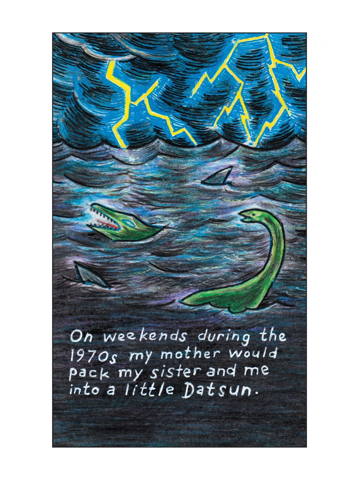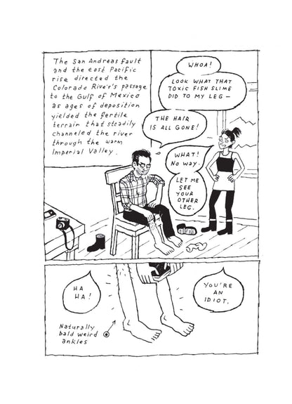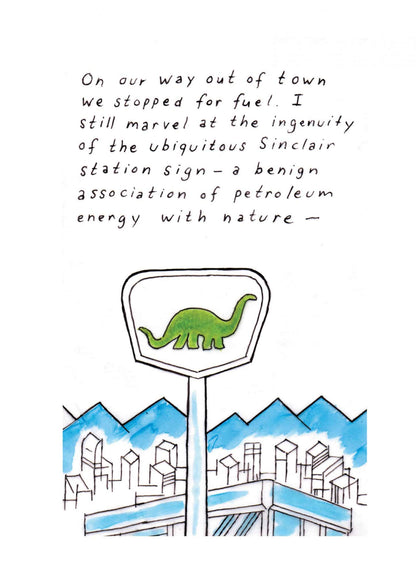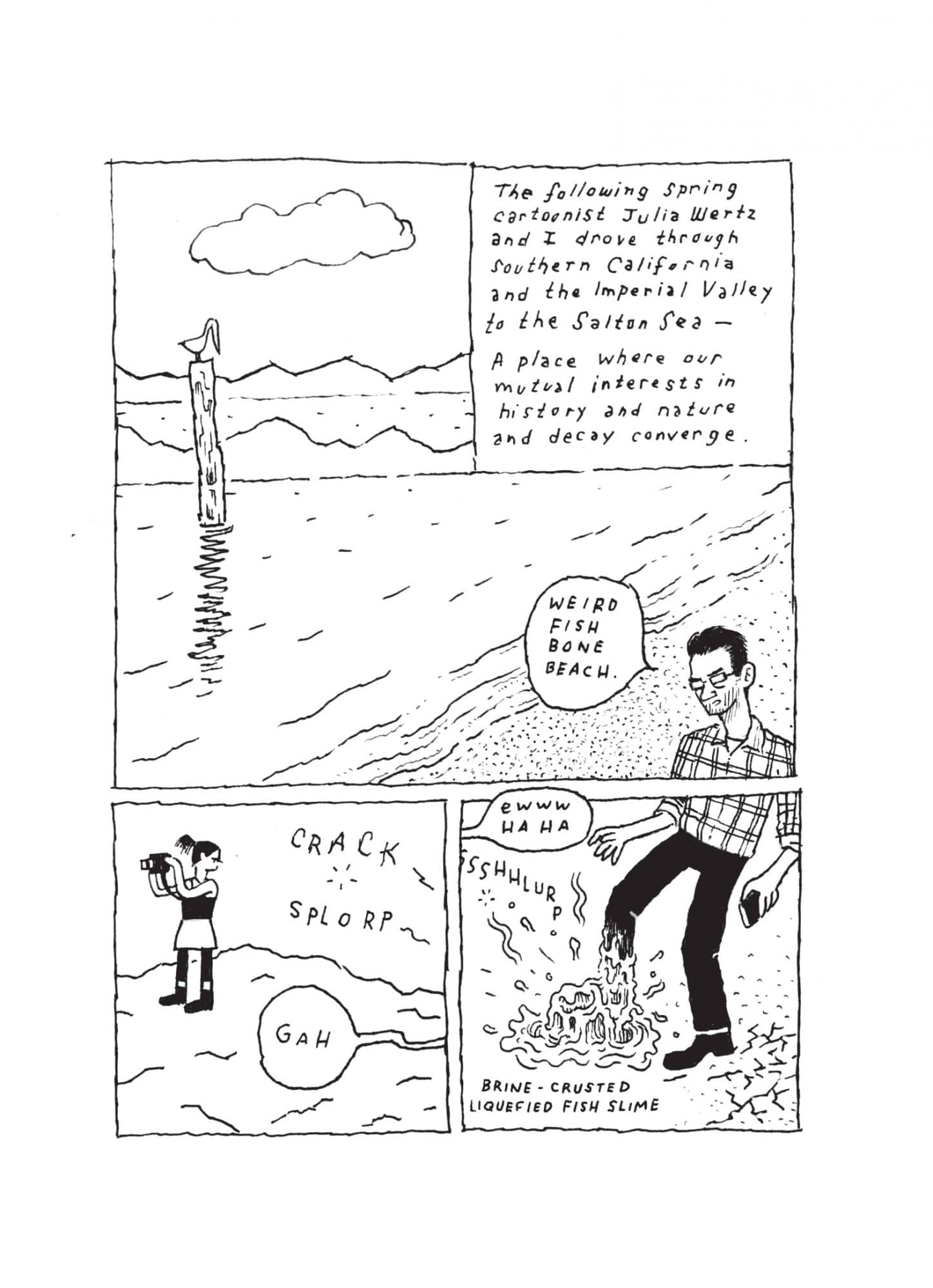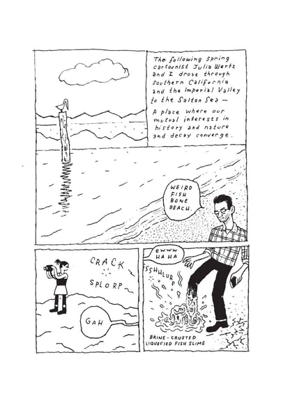Not a Place to Visit is a new collection of illustrated essays by WILD MAN cartoonist T Edward Bak. Exploring themes of social and ecological flux unique to environments in the western US through concisely rendered reflections this series examines the migration of the artist’s family to and from Colorado’s San Luis Valley, tourism and salmon on the Columbia River, the fraught ecosystem of southern California’s Salton Sea, and fracking along the northern Colorado prairie and Front Range.