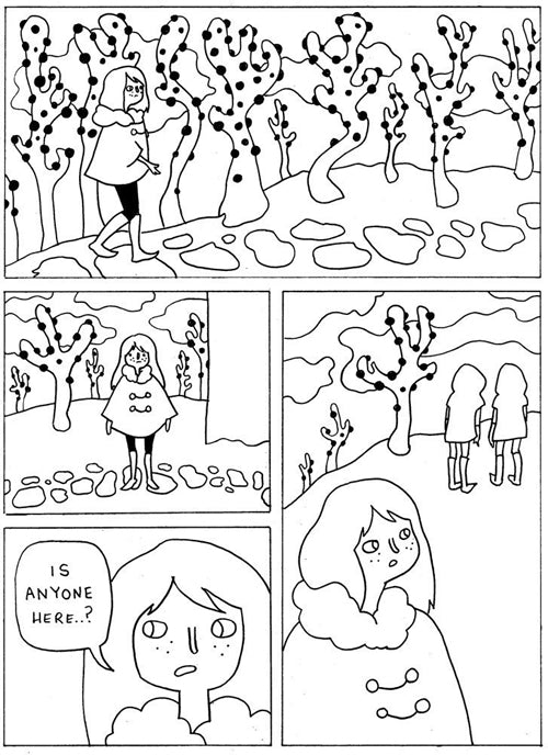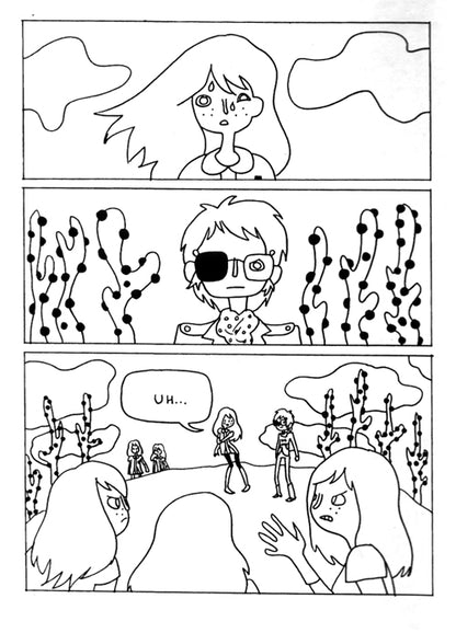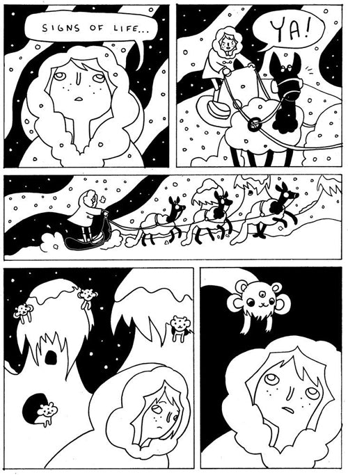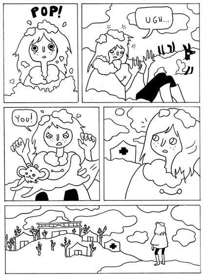 "Skelly throws a kitchen's sink worth of crazy and cute images at the reader. With a very simple and spare line, Skelly tosses in classic psychedelic images, which at its core is all about the ways in which black and white interact with each other. There are a number of pages that reflect that sort of interplay between the two opposites, with figures and background melting into and warping into each other. Skelly is still interested in telling a story, which is why the visuals draw the reader in rather than overwhelm the eye" -- Rob Clough, High-Low