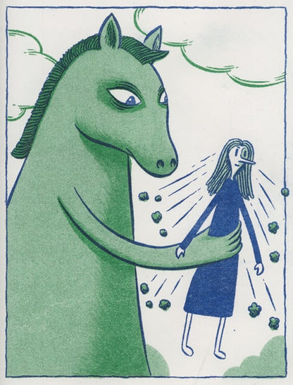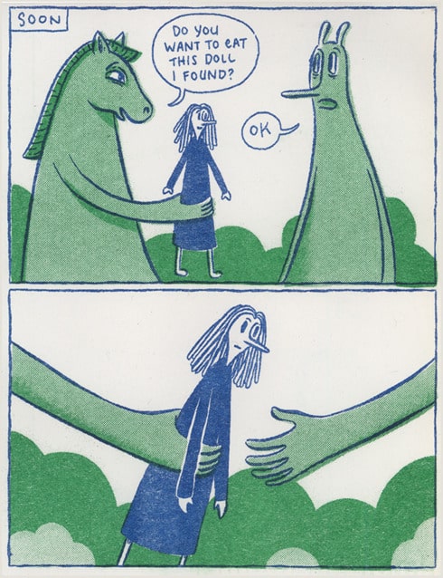 A 2-color risograph-printed minicomic about root vegetables, dolls, what we choose to do with our time, and the difficulty of making changes.