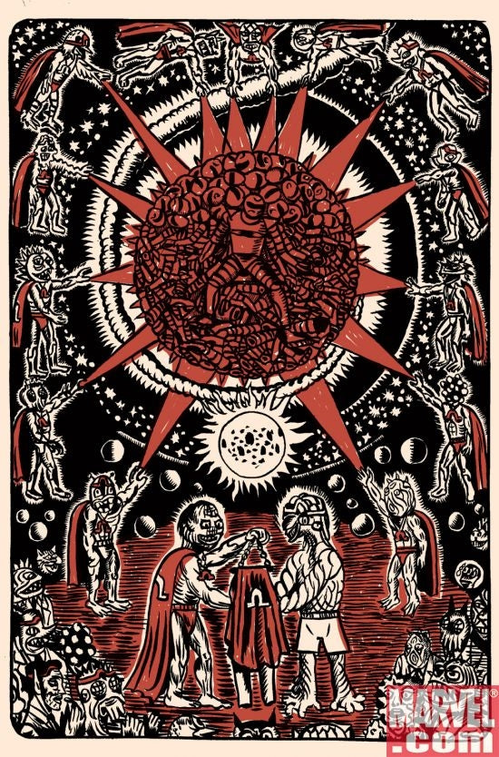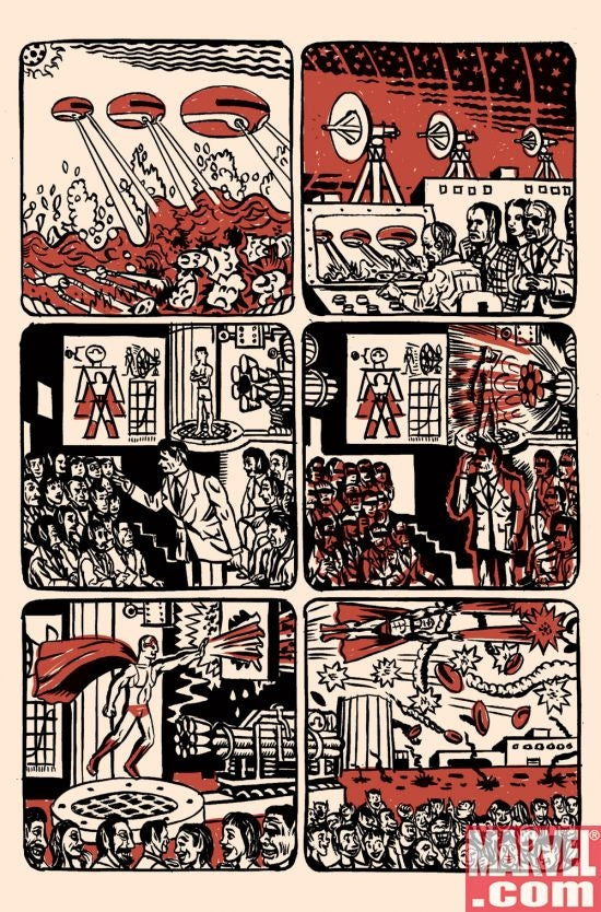 "Omega draws his own origin story in the form of a wordless comic. I draw it for him. At first I was going to draw it with really jagged lines like the punky stuff I did in the '70s, but I decided to draw kind of like I draw these days, but even a little more retarded than usual. I figured that a