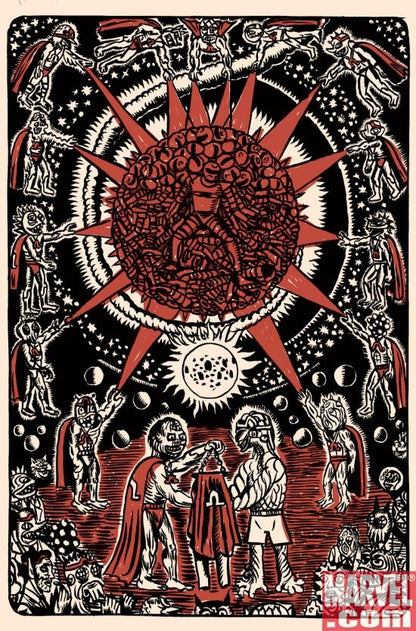 "You know a super hero's in trouble when he resorts to drawing a comic book to try to solve his problems! Omega The Unknown #7, on top of the usual stellar array of talent, features special guest-star creator Gary Panter, known for his work on a legendary children's show, Frank Zappa's album covers, and RAW Magazine — but he's never been between Marvel's covers before. Tune in!"