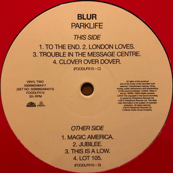 Tracklist: A1. Girls & Boys, A2. Tracy Jacks, A3. End Of A Century, B1. Parklife, B2. Bank Holiday, B3. Badhead, B4. The Debt Collector, B5. Far Out, C1. To The End, C2. London Loves, C3. Trouble In The Message Centre, C4. Clover Over Dover, D1. Magic America, D2. Jubilee, D3. This Is A Low, D4. Lot 105