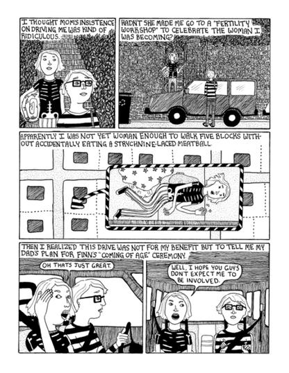 A heartfelt ode to growing up with well-intentioned but embarrassing parents. Framed by her brotherโs coming-of-age ceremony, Tessa recounts with minute details the experience of an oddball adolescence. Beautifully illustrated and perfectly toned. Nominated for two Ignatz Awards in the categories of Outstanding Comic and Promising New Talent.