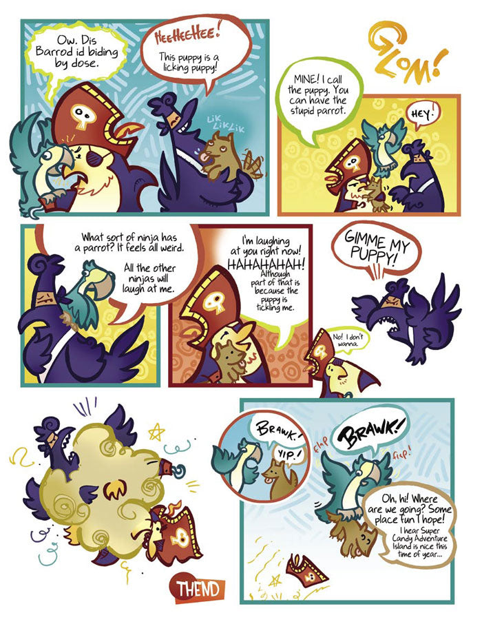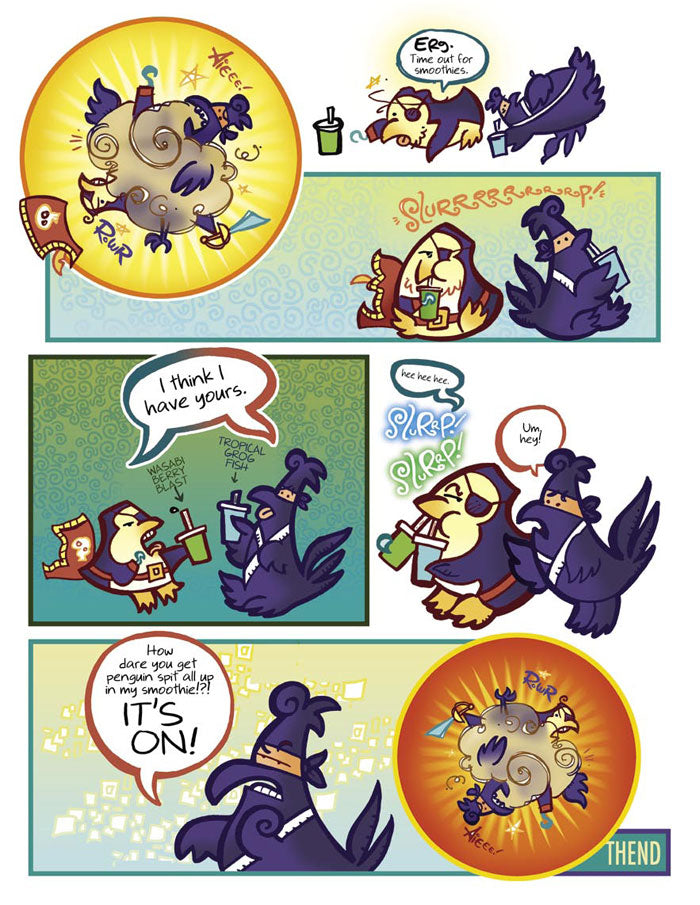 Pirate Penguin vs. Ninja Chicken (Book 1): Troublems with Frenemies. So what is this book about? It's about a Pirate Penguin named Pirate Penguin and a Ninja Chicken who isn't (ninjas are too sneaky to let you know their real names. Hint: It isn't Harold.) They are the bestest of friends and also the worstest of enemies all at the same time (just like in real life! Only more cartoony of course.) I think you'll like this book, there are about a bajillion jokes inside, and it's filled with action, adventure and arguments. Sometimes the stories are really teeny, about stuff like ice cream or origami, and sometimes the story gets really epic-tastic, filled with spaceships and giant monsters and evil koalas and stuff (just like real life!). Plus, being about pirates, there are at least 17 swordfights (that's the rule with pirates). You'll just have to go ahead and read it to see if you like it, I've run out of back cover room to convince you how awesome it is anyway. (How awesome? SO AWESOME!)