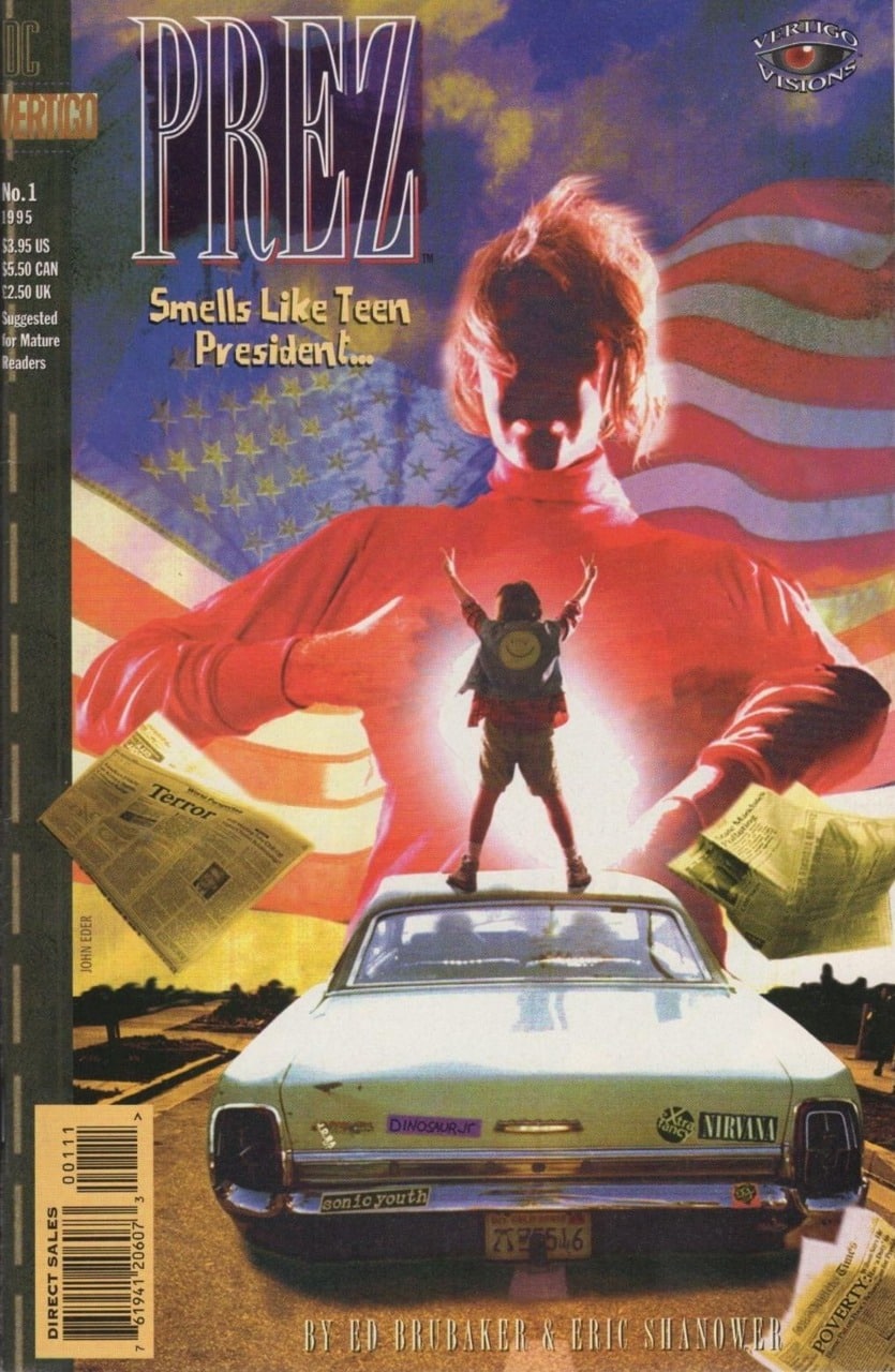 It begins in election year '96 with the country coming apart at the seams. Prez Rickard, long missing and presumed dead, has been sighted at a roadside diner in the American heartland. A trio of restless young misfits, one of whom believes he is Prez's son, sets out across America in search of answers to their country's woes - answers that only the former Chief Executive can provide. Written by Ed Brubaker, with art by Eric Shanower. Photo cover by John Eder. 68 pages. Suggested for Mature Readers. Mando Format.