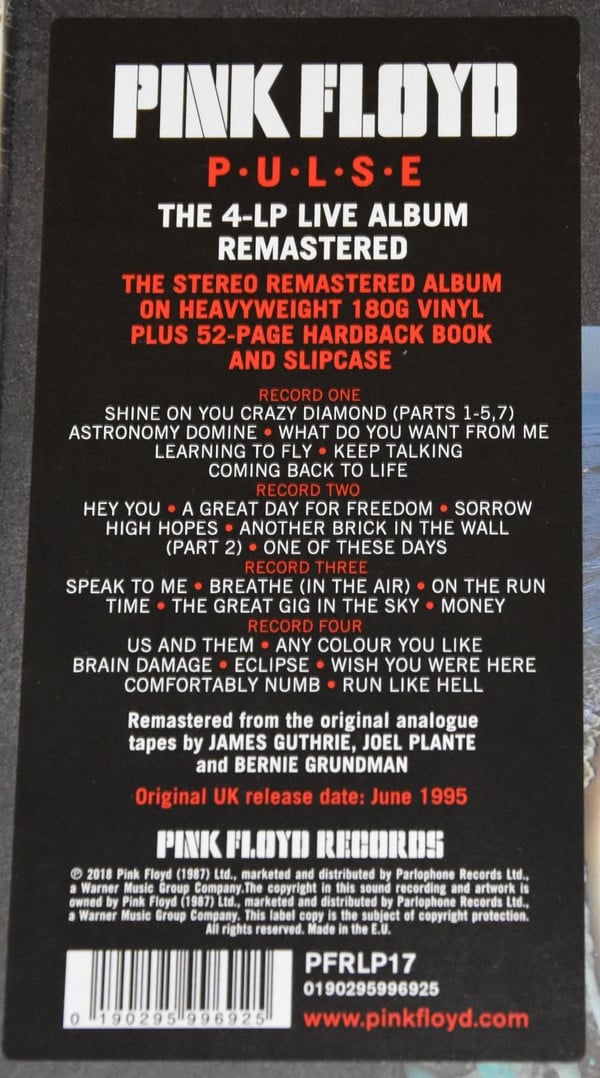 A re-release of the 1995 UK number 1 live album from the legendary Pink Floyd, now pressed on 180g vinyl across 4 LPs with remastered audio, included with a 52-page hardback book. 'PULSE' was compiled by James Guthrie, using various performances from the band's 1994 Division Bell tour across the UK and Europe featuring David Gilmour, Nick Mason and Richard Wright. The album includes 'The Dark Side of the Moon' performed in full, as well as a whole side dedicated to the show's encore.