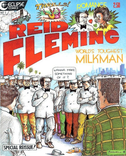 Reid Fleming, World's Toughest Milkman -- the only comic that actively promotes a pure Neanderthal weltanschauung! See how Reid deals with grouchy managers, angry customers, hot-rodding hoodlums, and mad dogs -- without once missing his favourite TV show!