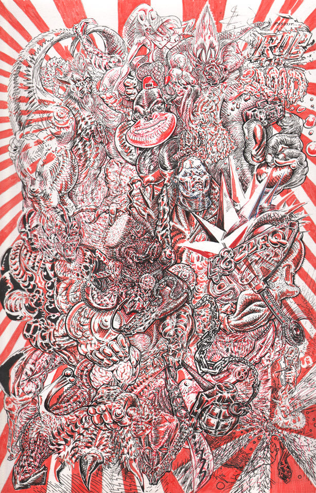 RUB THE BLOOD is an Art Comix tabloid that explores the lasting influence (for better or worse) of the Early 90's Collector Boom comics of Rob Liefeld, Jim Lee, Todd McFarlane, etc. on today's most fringe underground cartoonists.