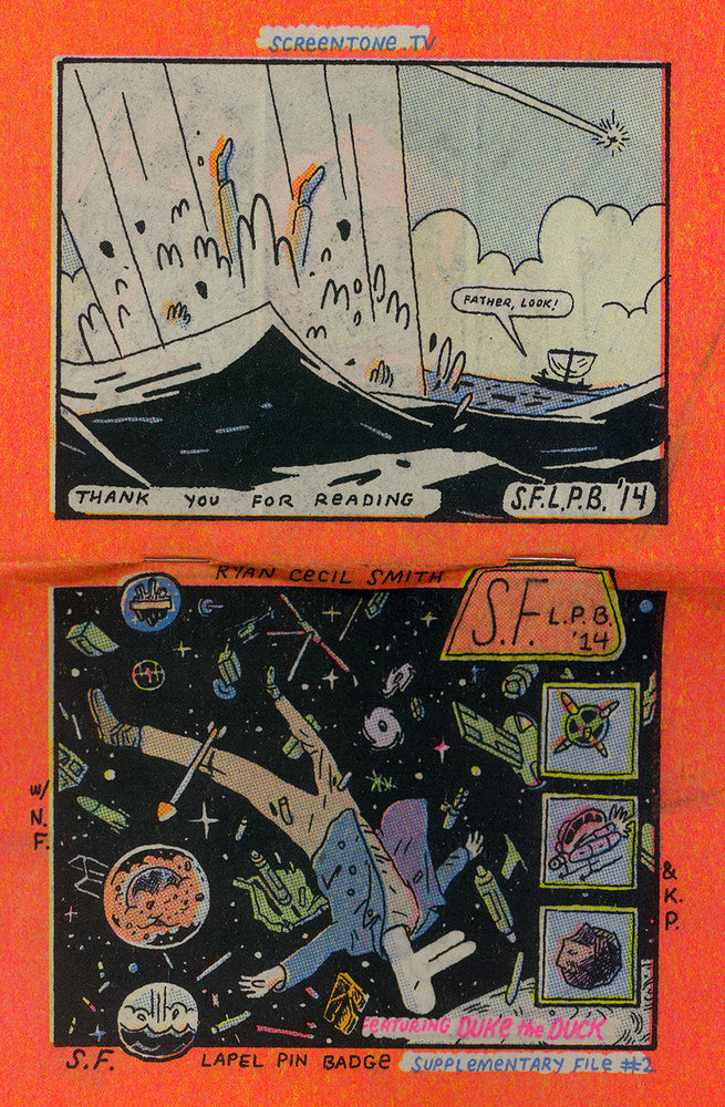 The Supplementary File to the 2014 S.F. Lapel Pin Badge is a 44-page 4-color risograph mini comic. Unprecendented bright, colorful, fun and weird faux-CMYK risograph colors. A limited edition. Printed in Japan and assembled in California.